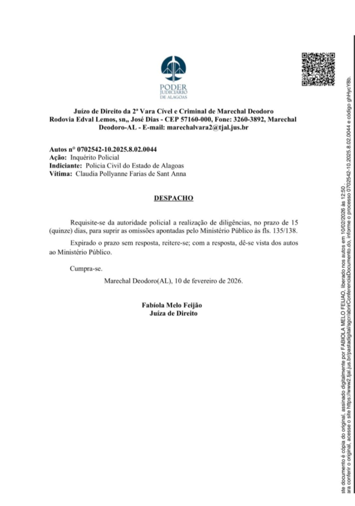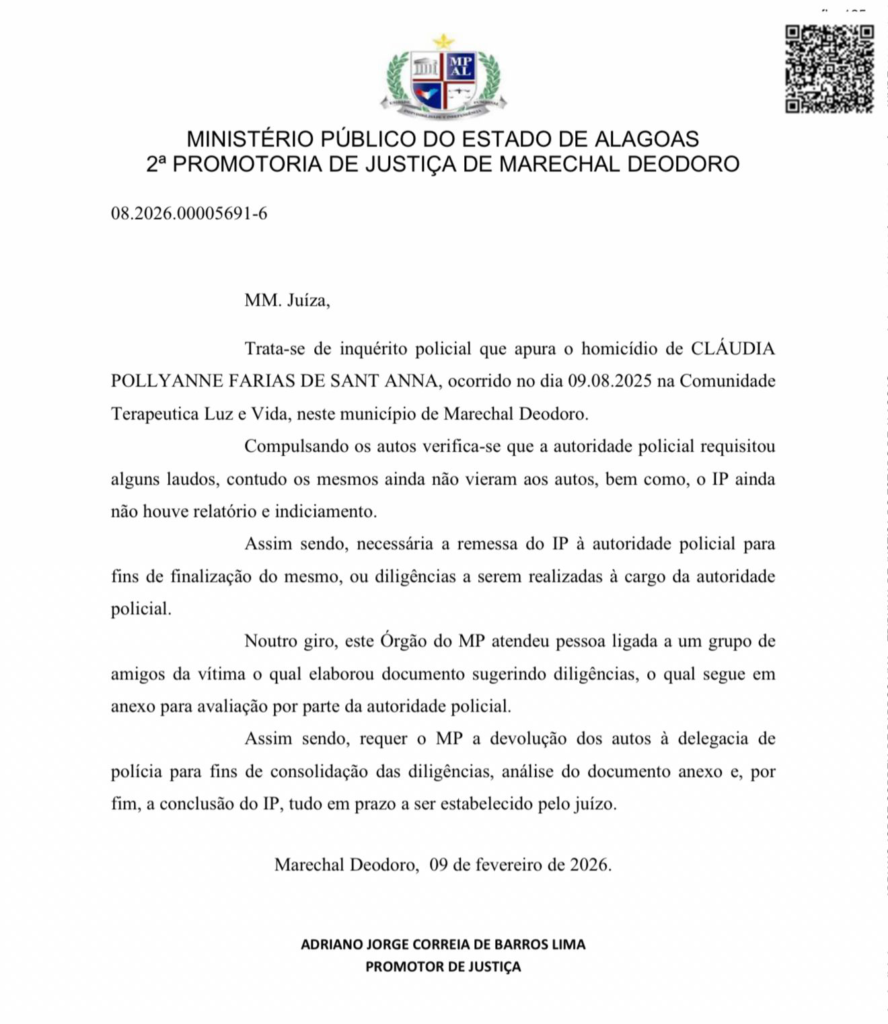 A Justiça de Alagoas determinou o retorno do inquérito que apura a morte da esteticista Cláudia Pollyanne Farias de Sant’Anna, de 41 anos, à Polícia Civil, após o Ministério Público Estadual apontar falhas e ausência de laudos técnicos considerados essenciais para o avanço da ação penal. O caso ocorreu em agosto de 2025, em uma clínica de reabilitação em Marechal Deodoro, na Região Metropolitana de Maceió.